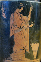 I try to find the funny in academic research whenever I can, and I was amused to come across the "spinning hetaira" this week. The spinning hetaira is to be a woman on Greek vases, who is approached by a man or boy holding a pouch as she spins wool. It is presumed that the pouch holds money with which to pay for the 'hetaira''s services. A few problems with this, as argued by Gloria Ferrari (in Figures of Speech: Men and Maidens in Ancient Greece): 1) The women are not dressed as hetairai 2) It was part of a hetaira's mystique to avoid dealing directly with money 3) Identical pouches are identified as holding game pieces, not money, in other contexts.